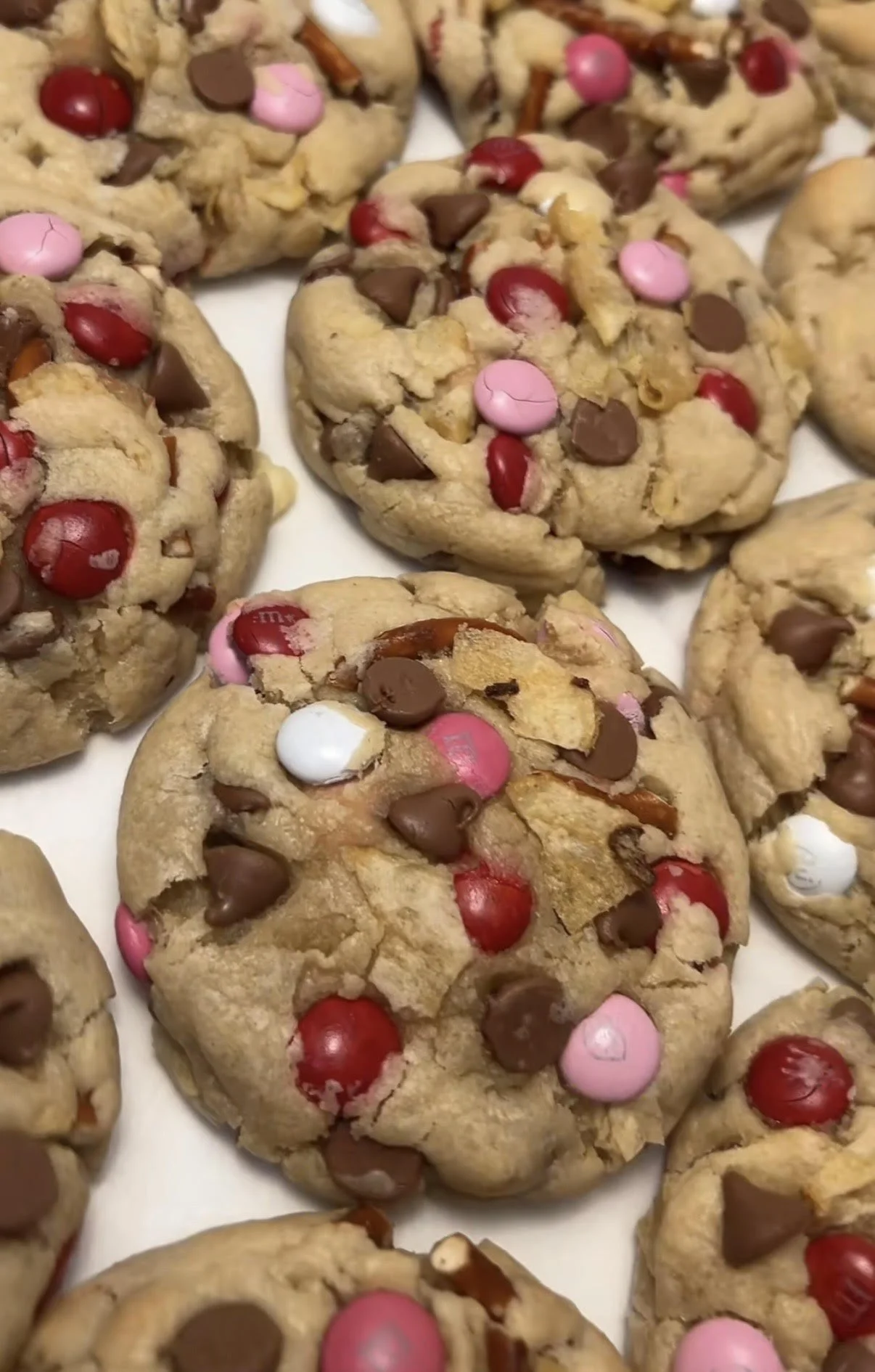 Sweet and salty combine in a mix of chocolate chips, potato chips, pretzel pieces, and M&Ms.